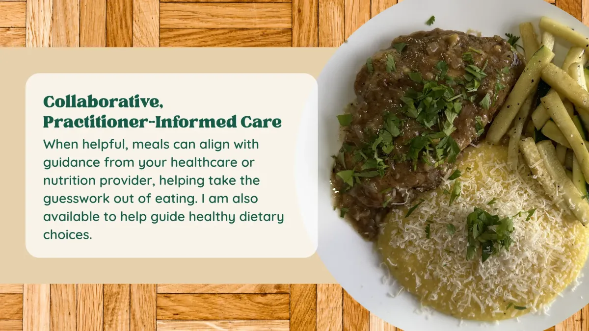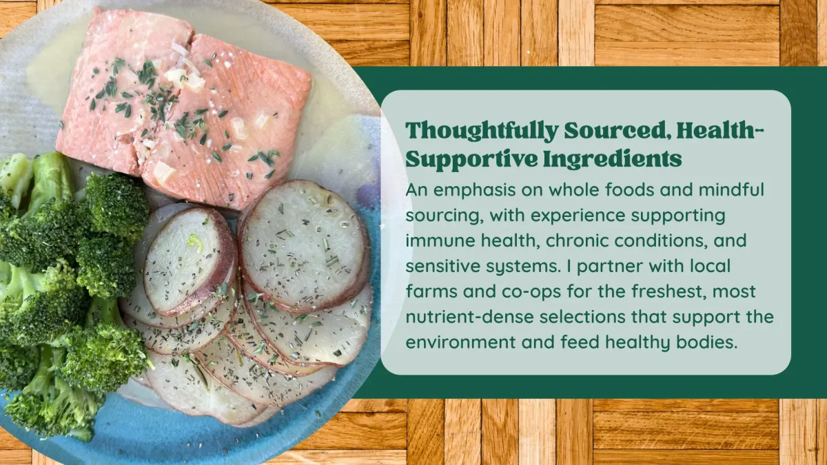 In addition to personal chef services, I offer health coaching, grief support, and craniosacral therapy to support nervous system regulation and overall well-being. The goal is to make nourishment feel simple, supportive, and aligned with each person’s unique health needs — especially during tender or overwhelming times of life.