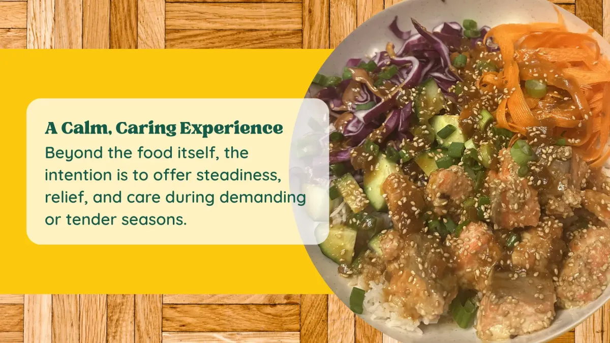 I provide thoughtfully prepared food and gentle wellness services designed to support your body, nervous system, and emotional well-being during demanding or tender seasons of life.