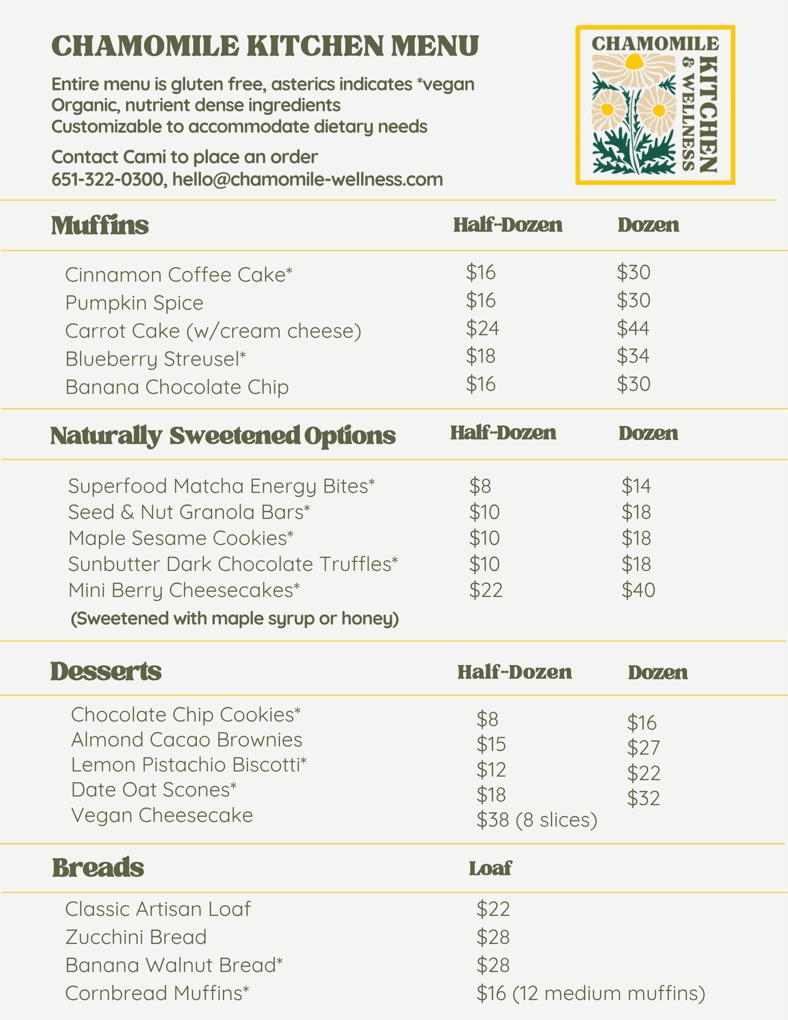 To see the current baked goods menu, please reach out to Cami by email: [email protected]